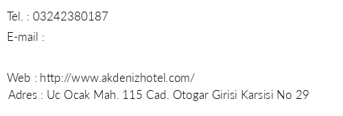 Akdeniz Hotel iletişim bilgileri, booking, adres bilgileri, web site ve mail adresi, resimleri, haritası, yol tarifi, nasıl gidilir, erken rezervasyon fiyatları bilgilendirme amaçlı olup, değişiklik arz edebilir. Yanlışlıklardan dolayı Oteliletisim.com sorumlu tutulamaz.