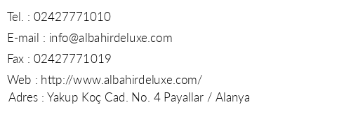 Al Bahir Deluxe Hotel iletişim bilgileri, booking, adres bilgileri, web site ve mail adresi, resimleri, haritası, yol tarifi, nasıl gidilir, erken rezervasyon fiyatları bilgilendirme amaçlı olup, değişiklik arz edebilir. Yanlışlıklardan dolayı Oteliletisim.com sorumlu tutulamaz.