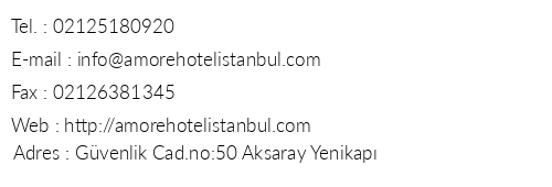 Amore Hotel iletişim bilgileri, booking, adres bilgileri, web site ve mail adresi, resimleri, haritası, yol tarifi, nasıl gidilir, erken rezervasyon fiyatları bilgilendirme amaçlı olup, değişiklik arz edebilir. Yanlışlıklardan dolayı Oteliletisim.com sorumlu tutulamaz.
