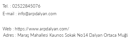 Arp Dalyan iletişim bilgileri, booking, adres bilgileri, web site ve mail adresi, resimleri, haritası, yol tarifi, nasıl gidilir, erken rezervasyon fiyatları bilgilendirme amaçlı olup, değişiklik arz edebilir. Yanlışlıklardan dolayı Oteliletisim.com sorumlu tutulamaz.