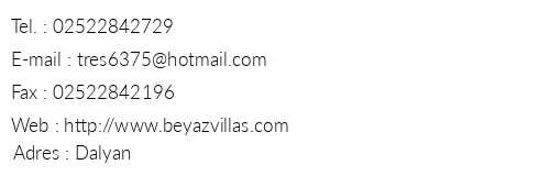 Beyaz Villas iletişim bilgileri, booking, adres bilgileri, web site ve mail adresi, resimleri, haritası, yol tarifi, nasıl gidilir, erken rezervasyon fiyatları bilgilendirme amaçlı olup, değişiklik arz edebilir. Yanlışlıklardan dolayı Oteliletisim.com sorumlu tutulamaz.