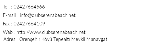 Club Serena Beach iletişim bilgileri, booking, adres bilgileri, web site ve mail adresi, resimleri, haritası, yol tarifi, nasıl gidilir, erken rezervasyon fiyatları bilgilendirme amaçlı olup, değişiklik arz edebilir. Yanlışlıklardan dolayı Oteliletisim.com sorumlu tutulamaz.