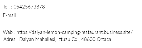 Dalyan Lemon Camping Restaurant Bungalows iletişim bilgileri, booking, adres bilgileri, web site ve mail adresi, resimleri, haritası, yol tarifi, nasıl gidilir, erken rezervasyon fiyatları bilgilendirme amaçlı olup, değişiklik arz edebilir. Yanlışlıklardan dolayı Oteliletisim.com sorumlu tutulamaz.