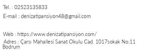 Denizatı Pansiyon iletişim bilgileri, booking, adres bilgileri, web site ve mail adresi, resimleri, haritası, yol tarifi, nasıl gidilir, erken rezervasyon fiyatları bilgilendirme amaçlı olup, değişiklik arz edebilir. Yanlışlıklardan dolayı Oteliletisim.com sorumlu tutulamaz.
