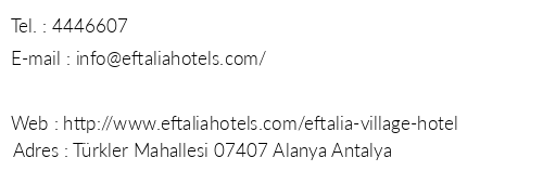 Eftalia Village Hotel iletişim bilgileri, booking, adres bilgileri, web site ve mail adresi, resimleri, haritası, yol tarifi, nasıl gidilir, erken rezervasyon fiyatları bilgilendirme amaçlı olup, değişiklik arz edebilir. Yanlışlıklardan dolayı Oteliletisim.com sorumlu tutulamaz.