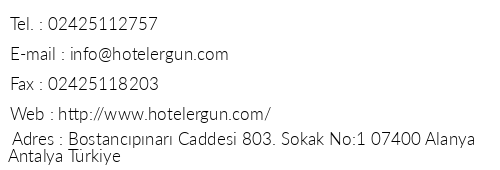 Ergün Hotel Alanya iletişim bilgileri, booking, adres bilgileri, web site ve mail adresi, resimleri, haritası, yol tarifi, nasıl gidilir, erken rezervasyon fiyatları bilgilendirme amaçlı olup, değişiklik arz edebilir. Yanlışlıklardan dolayı Oteliletisim.com sorumlu tutulamaz.