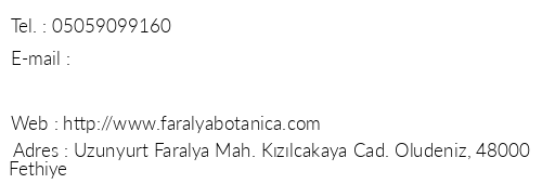 Faralya Botanica iletişim bilgileri, booking, adres bilgileri, web site ve mail adresi, resimleri, haritası, yol tarifi, nasıl gidilir, erken rezervasyon fiyatları bilgilendirme amaçlı olup, değişiklik arz edebilir. Yanlışlıklardan dolayı Oteliletisim.com sorumlu tutulamaz.