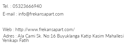 Frekans Apart iletişim bilgileri, booking, adres bilgileri, web site ve mail adresi, resimleri, haritası, yol tarifi, nasıl gidilir, erken rezervasyon fiyatları bilgilendirme amaçlı olup, değişiklik arz edebilir. Yanlışlıklardan dolayı Oteliletisim.com sorumlu tutulamaz.