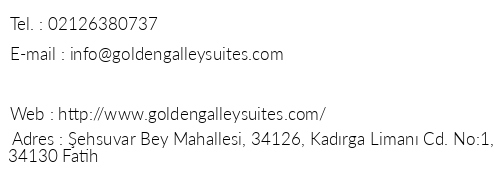 Golden Galley Suites iletişim bilgileri, booking, adres bilgileri, web site ve mail adresi, resimleri, haritası, yol tarifi, nasıl gidilir, erken rezervasyon fiyatları bilgilendirme amaçlı olup, değişiklik arz edebilir. Yanlışlıklardan dolayı Oteliletisim.com sorumlu tutulamaz.