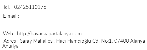 Havana Apart Otel iletişim bilgileri, booking, adres bilgileri, web site ve mail adresi, resimleri, haritası, yol tarifi, nasıl gidilir, erken rezervasyon fiyatları bilgilendirme amaçlı olup, değişiklik arz edebilir. Yanlışlıklardan dolayı Oteliletisim.com sorumlu tutulamaz.