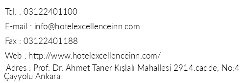 Hotel Excellence İnn iletişim bilgileri, booking, adres bilgileri, web site ve mail adresi, resimleri, haritası, yol tarifi, nasıl gidilir, erken rezervasyon fiyatları bilgilendirme amaçlı olup, değişiklik arz edebilir. Yanlışlıklardan dolayı Oteliletisim.com sorumlu tutulamaz.