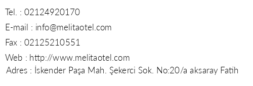 Hotel Melita iletişim bilgileri, booking, adres bilgileri, web site ve mail adresi, resimleri, haritası, yol tarifi, nasıl gidilir, erken rezervasyon fiyatları bilgilendirme amaçlı olup, değişiklik arz edebilir. Yanlışlıklardan dolayı Oteliletisim.com sorumlu tutulamaz.