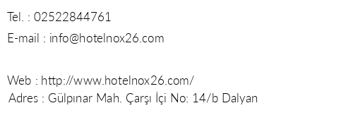 Hotel Nox26 iletişim bilgileri, booking, adres bilgileri, web site ve mail adresi, resimleri, haritası, yol tarifi, nasıl gidilir, erken rezervasyon fiyatları bilgilendirme amaçlı olup, değişiklik arz edebilir. Yanlışlıklardan dolayı Oteliletisim.com sorumlu tutulamaz.