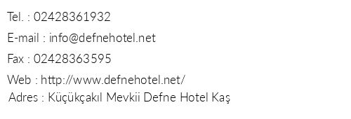 Kaş Defne Hotel iletişim bilgileri, booking, adres bilgileri, web site ve mail adresi, resimleri, haritası, yol tarifi, nasıl gidilir, erken rezervasyon fiyatları bilgilendirme amaçlı olup, değişiklik arz edebilir. Yanlışlıklardan dolayı Oteliletisim.com sorumlu tutulamaz.