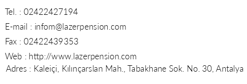 Lazer Pansiyon iletişim bilgileri, booking, adres bilgileri, web site ve mail adresi, resimleri, haritası, yol tarifi, nasıl gidilir, erken rezervasyon fiyatları bilgilendirme amaçlı olup, değişiklik arz edebilir. Yanlışlıklardan dolayı Oteliletisim.com sorumlu tutulamaz.