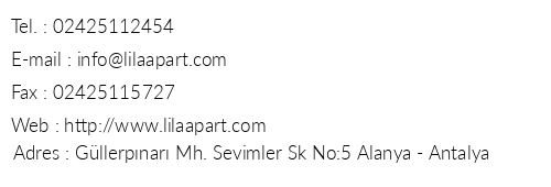 Lila Apart Hotel iletişim bilgileri, booking, adres bilgileri, web site ve mail adresi, resimleri, haritası, yol tarifi, nasıl gidilir, erken rezervasyon fiyatları bilgilendirme amaçlı olup, değişiklik arz edebilir. Yanlışlıklardan dolayı Oteliletisim.com sorumlu tutulamaz.
