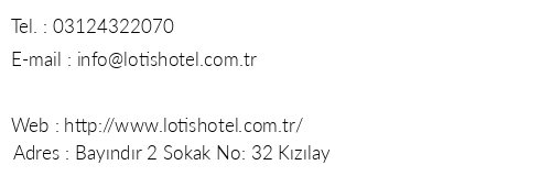 Lotis Hotel iletişim bilgileri, booking, adres bilgileri, web site ve mail adresi, resimleri, haritası, yol tarifi, nasıl gidilir, erken rezervasyon fiyatları bilgilendirme amaçlı olup, değişiklik arz edebilir. Yanlışlıklardan dolayı Oteliletisim.com sorumlu tutulamaz.