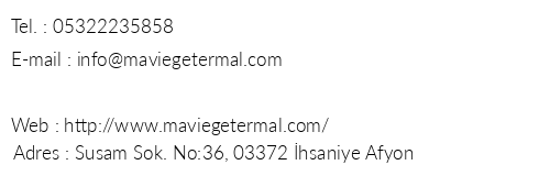 Mavi Ege Termal iletişim bilgileri, booking, adres bilgileri, web site ve mail adresi, resimleri, haritası, yol tarifi, nasıl gidilir, erken rezervasyon fiyatları bilgilendirme amaçlı olup, değişiklik arz edebilir. Yanlışlıklardan dolayı Oteliletisim.com sorumlu tutulamaz.
