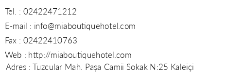 Mia Hotel iletişim bilgileri, booking, adres bilgileri, web site ve mail adresi, resimleri, haritası, yol tarifi, nasıl gidilir, erken rezervasyon fiyatları bilgilendirme amaçlı olup, değişiklik arz edebilir. Yanlışlıklardan dolayı Oteliletisim.com sorumlu tutulamaz.