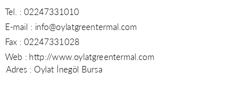 Oylat Green Termal iletişim bilgileri, booking, adres bilgileri, web site ve mail adresi, resimleri, haritası, yol tarifi, nasıl gidilir, erken rezervasyon fiyatları bilgilendirme amaçlı olup, değişiklik arz edebilir. Yanlışlıklardan dolayı Oteliletisim.com sorumlu tutulamaz.