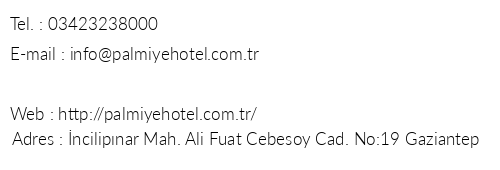 Palmiye Hotel Gaziantep iletişim bilgileri, booking, adres bilgileri, web site ve mail adresi, resimleri, haritası, yol tarifi, nasıl gidilir, erken rezervasyon fiyatları bilgilendirme amaçlı olup, değişiklik arz edebilir. Yanlışlıklardan dolayı Oteliletisim.com sorumlu tutulamaz.
