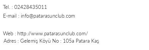 Patara Sun Club iletişim bilgileri, booking, adres bilgileri, web site ve mail adresi, resimleri, haritası, yol tarifi, nasıl gidilir, erken rezervasyon fiyatları bilgilendirme amaçlı olup, değişiklik arz edebilir. Yanlışlıklardan dolayı Oteliletisim.com sorumlu tutulamaz.