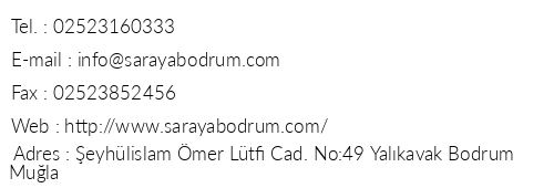 Saraya Bodrum Otel iletişim bilgileri, booking, adres bilgileri, web site ve mail adresi, resimleri, haritası, yol tarifi, nasıl gidilir, erken rezervasyon fiyatları bilgilendirme amaçlı olup, değişiklik arz edebilir. Yanlışlıklardan dolayı Oteliletisim.com sorumlu tutulamaz.