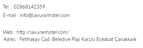 Savuran Hotel iletişim bilgileri, booking, adres bilgileri, web site ve mail adresi, resimleri, haritası, yol tarifi, nasıl gidilir, erken rezervasyon fiyatları bilgilendirme amaçlı olup, değişiklik arz edebilir. Yanlışlıklardan dolayı Oteliletisim.com sorumlu tutulamaz.