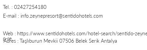 Sentido Zeynep Resort iletişim bilgileri, booking, adres bilgileri, web site ve mail adresi, resimleri, haritası, yol tarifi, nasıl gidilir, erken rezervasyon fiyatları bilgilendirme amaçlı olup, değişiklik arz edebilir. Yanlışlıklardan dolayı Oteliletisim.com sorumlu tutulamaz.