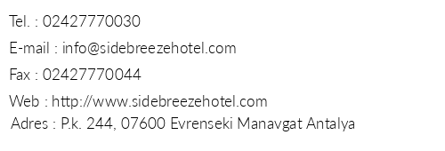 Side Breeze Hotel iletişim bilgileri, booking, adres bilgileri, web site ve mail adresi, resimleri, haritası, yol tarifi, nasıl gidilir, erken rezervasyon fiyatları bilgilendirme amaçlı olup, değişiklik arz edebilir. Yanlışlıklardan dolayı Oteliletisim.com sorumlu tutulamaz.