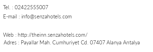 Senza The İnn Resort Hotel iletişim bilgileri, booking, adres bilgileri, web site ve mail adresi, resimleri, haritası, yol tarifi, nasıl gidilir, erken rezervasyon fiyatları bilgilendirme amaçlı olup, değişiklik arz edebilir. Yanlışlıklardan dolayı Oteliletisim.com sorumlu tutulamaz.
